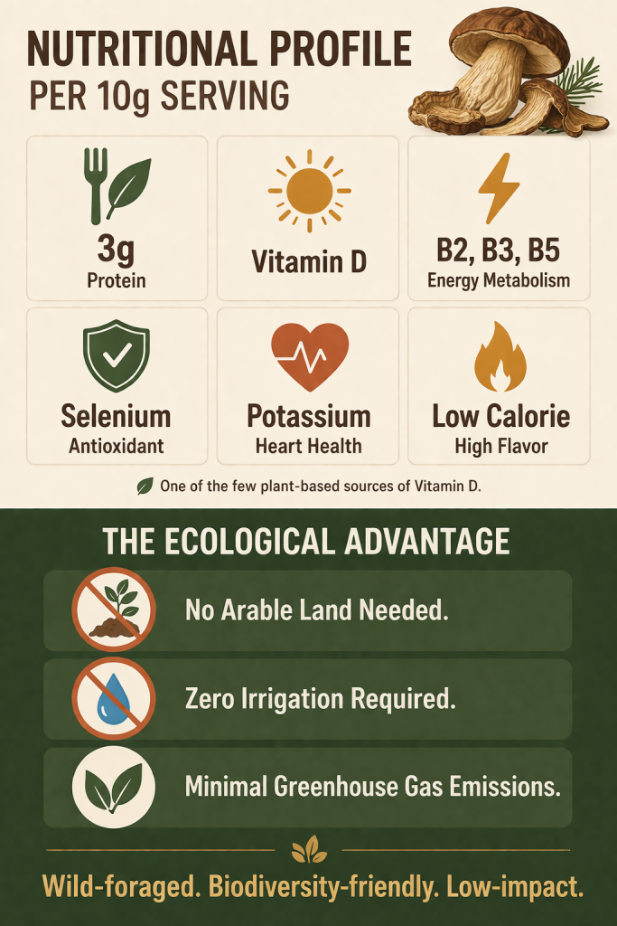 Beyond nutrition, there’s a strong environmental case for using porcini regularly. Mushrooms require no arable land, no irrigation, and produce a fraction of the greenhouse gases associated with animal agriculture. Porcini are often wild-foraged from established forest ecosystems, meaning their harvest supports biodiversity rather than disrupting it. When sourced responsibly, they represent one of the most low-impact flavor and protein sources available to the home cook.