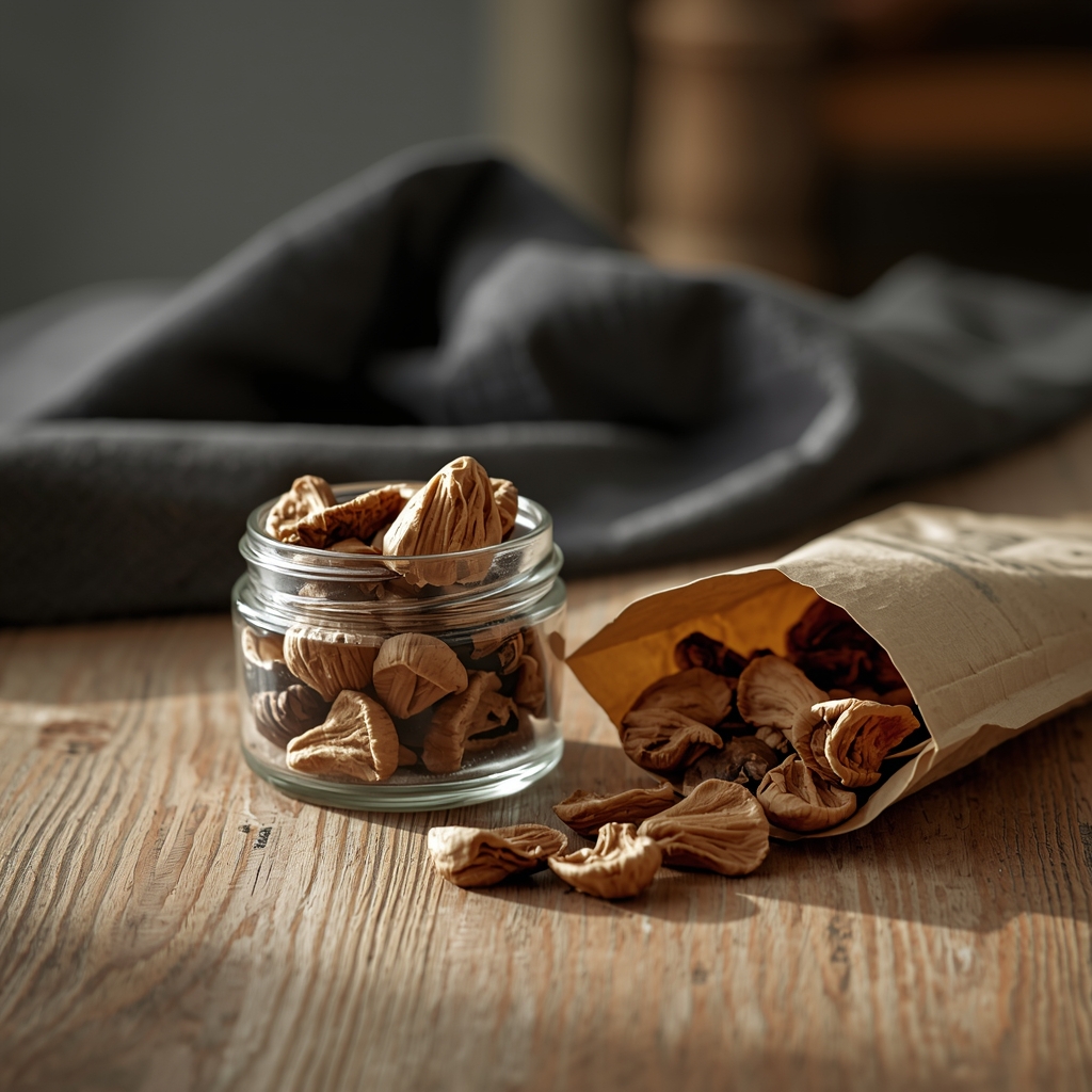 Store dried porcini in an airtight glass jar, away from heat, light, and humidity. A dark cupboard works well, and properly stored mushrooms stay excellent for up to two years. For bulk purchases, vacuum-sealed bags extend shelf life even further.