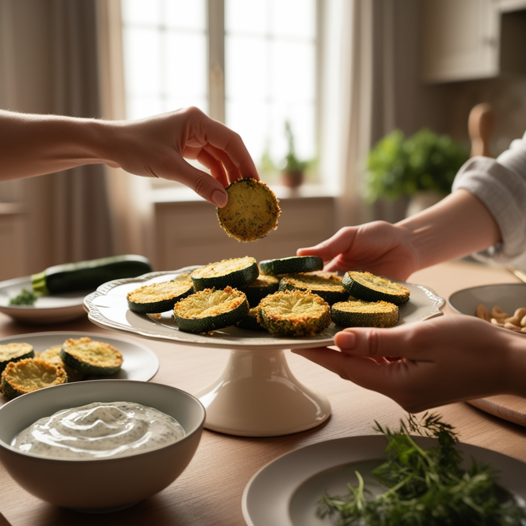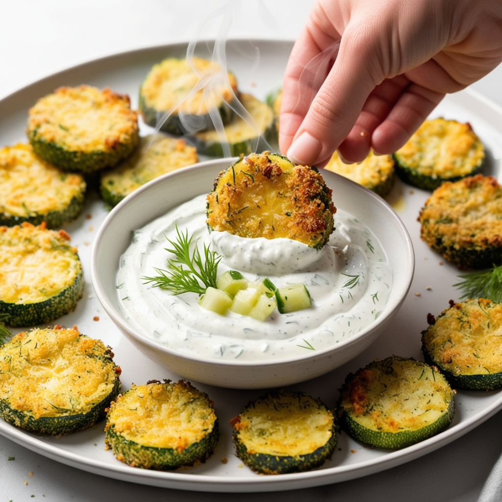 - Serve warm zucchini rounds with cool tzatziki for dipping