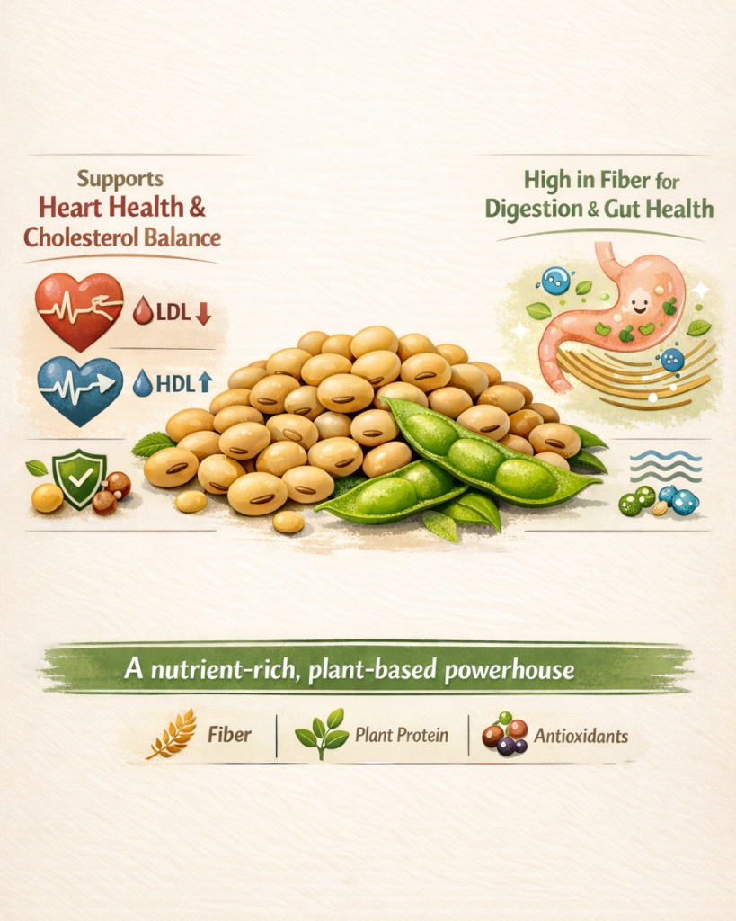 Soybeans offer a wealth of benefits that cater to heart health and improve digestion. They are a notable source of dietary fiber and antioxidants, which are essential for maintaining overall health.